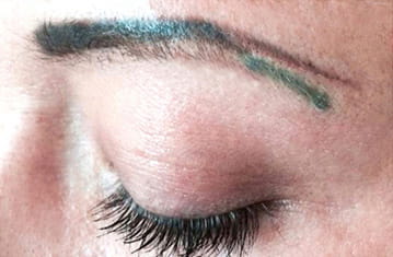 Es gelang der zweiten Stylistin nicht, die erste Fehlzeichnung erfolgreich abzudecken und meine Kundin entschloss sich zu einer Entfernung mittels Laser-Behandlung. Die Farbe der Fehlzeichnung, die eigentlich verschwinden sollte, wurde durch die Bestrahlung gesprengt und schlug in ein kräftiges Grün um. Außerdem entdeckt man um die grüne Linie herum einen weißlichen Rand.