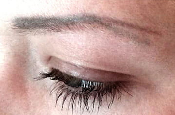 Zuerst wurden die Augenbrauen im Auslauf viel zu tief gezeichnet. Dieser Fehler geschieht häufig, da die Stylistin sich am eigenen Haarwuchs der Kundin orientiert hat und nicht nach der Ideal-Linie. Bei vielen Frauen wachsen die Brauen eher zu tief und deshalb müssen auch Härchen gezupft werden. Würden die Augenbrauen in der Ideallinie wachsen, wäre ein Permanent Make-up unnötig. Bei den meisten Augenbrauen-Permanent Make-ups wird daher der äußere Auslauf etwas höher gesetzt.
